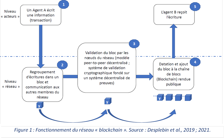 Les blocs de la chaîne sont ordonnés suivant des numéros de hachage. La fonction de hachage, de l'anglais hash function (hash : de l’anglais, recouper et mélanger), sert à calculer une empreinte numérique unique à partir d'une donnée fournie en entrée. Chaque bloc portant le numéro de hash du précédent bloc, il est impossible d’intervertir des blocs. Le schéma suivant proposé par Desplebin et al. (2021) résume le fonctionnement de ce réseau (cf. figure 1).