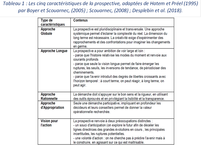 Notre méthodologie s’appuie sur une « activité prospective » (Bootz, 2005) visant à « stimuler l’intuition des acteurs et à développer une compréhension nouvelle du monde » (Mérindol et al., 2009). Plus particulièrement notre réflexion suit la méthodologie de la prospective métier développée par (Boyer & Scouarnec, 2002 ; 2005) qui vise notamment à l’identification de scénarii possibles (Dumoutier et al., 2022) sur l’évolution des métiers, mais aussi plus généralement sur les futurs les plus probables que les entreprises auront à affronter (Kin et al., 2018a ; Bentalha et al. 2020) : « Il s’agit alors d’imaginer les conséquences de ces tendances sur les situations réelles du travail, l’organisation du travail et les métiers » (Mérindol et al., 2009). Cette approche a notamment été utilisée pour étudier les effets de la mise en œuvre de la blockchain en comptabilité et audit (Desplebin et al., 2018), en SCM (Kin et al., 2018a), et plus globalement pour analyser l’évolution des services (Bentalha et al. 2020). Scouarnec (2008), définit la prospective comme « l’élaboration d’une réflexion sur les avenirs possibles et reposant sur une méthodologie appropriée (…). La prospective est de l’ordre de l’anticipation, même imparfaite, des changements, des discontinuités, des éventualités. (…)». (Desplebin et al., 2018), citant les travaux de (Hatem et Préel, 1995) rappellent qu’il existe cinq caractéristiques de la prospective : globale, longue, rationnelle, d'appropriation et c'est une vision pour l'action ( tableau 1).