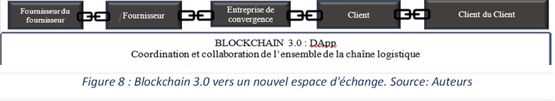 La blockchain étant un registre distribué, ses données sont le résultat de transactions certifiées entre les acteurs de la même chaîne logistique. La blockchain serait de ce point de vue, la solution permettant une collaboration complète et totale entre les acteurs, comme le décrit la figure 7.
