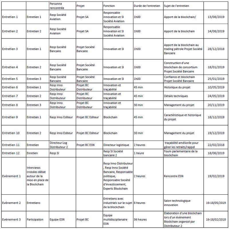 La démarche prospective s’appuie sur une multitude de sources : productions scientifiques, productions « grises », avis d’experts notamment. Dans cette étude, de façon très pratique, notre démarche prospective s’appuie, au-delà de la réflexion d’auteurs-experts, sur des rencontres et échanges avec des experts de la blockchain, notamment lors d’entretiens et de travaux menés au sein d’une Entreprise de Services Numériques (annexe 1), mais aussi lors de conférences professionnelles de référence (Salon Bpifrance Inno Génération 2018, West Data Festival 2019, VivaTech 2019, Forum de la blockchain 2018, 2019, Rencontres Dumont d’Urville 2019, « les « ROIs » de la blockchain 2019 ») et de plusieurs Hackathons (Africa Blockchain Summit 2018, Hackathon Blockchain and Shop 2018 ). Enfin, elle se base sur la mobilisation de productions académiques et professionnelles sur le sujet. Les éléments discutés dans la suite de cet article sont le fruit de ces rencontres et réflexions. L’ensemble des entretiens, séances de travail et références théoriques a fait l’objet d’un codage selon les principes du modèle d'Eisenhardt (Eisenhardt, 1989). L'analyse menée s'appuie sur les étapes suivantes.