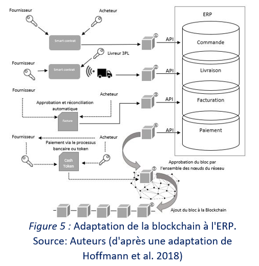 En conséquence, nous pensons que les entreprises devront modifier leurs ERP, de manière à rendre l’ensemble du couplage blockchain – ERP fonctionnel et bénéficier ainsi d’un certain degré d’automatisation. Comme l’a noté (Mearian, 2017), citant un représentant d’EY, cela semble être un défi moins grand qu’il n’y paraît puisque de nombreuses entreprises utilisent déjà des outils semblables « pour l’EDI, XML ou pour l’analyse d’intégration des données ». Des modèles existent désormais permettant une traduction et une intégration de différents messages EDI ou XML dans une blockchain (Li, et al., 2017 ; Fiaidhi et al., 2018). Comme le souligne O’Leary (2017), une alternative à l’adoption de modèles types EDI pour récupérer les données de la blockchain consiste à modifier l’ERP. La figure 5 ci-dessous représente l’intégration d’une blockchain à travers les différentes couches d’un ERP : commande, bon de livraison, facturation, paiement ; chaque étape est jalonnée par une authentification des actes dans une blockchain grâce au principe des signatures cryptographiques. L’ensemble des données de la blockchain représentant une couche sous-jacente à la base données ERP. Ainsi, ces progiciels de gestion évolueraient, passant d’une base de données centralisée et relationnelle, à une base de données, automatisée et transactionnelle dans une perspective plus large de gestion du big data (Karamchandani et al., 2022). De plus, le paiement automatisé via un token (actif numérique émis et échangeable sur une blockchain) au sein d’un réseau inter-organisationnel permettrait d’accélérer les paiements de façon sécurisé et contribuerait ainsi à une nette diminution des BFR de l’ensemble des partenaires de la chaîne logistique.