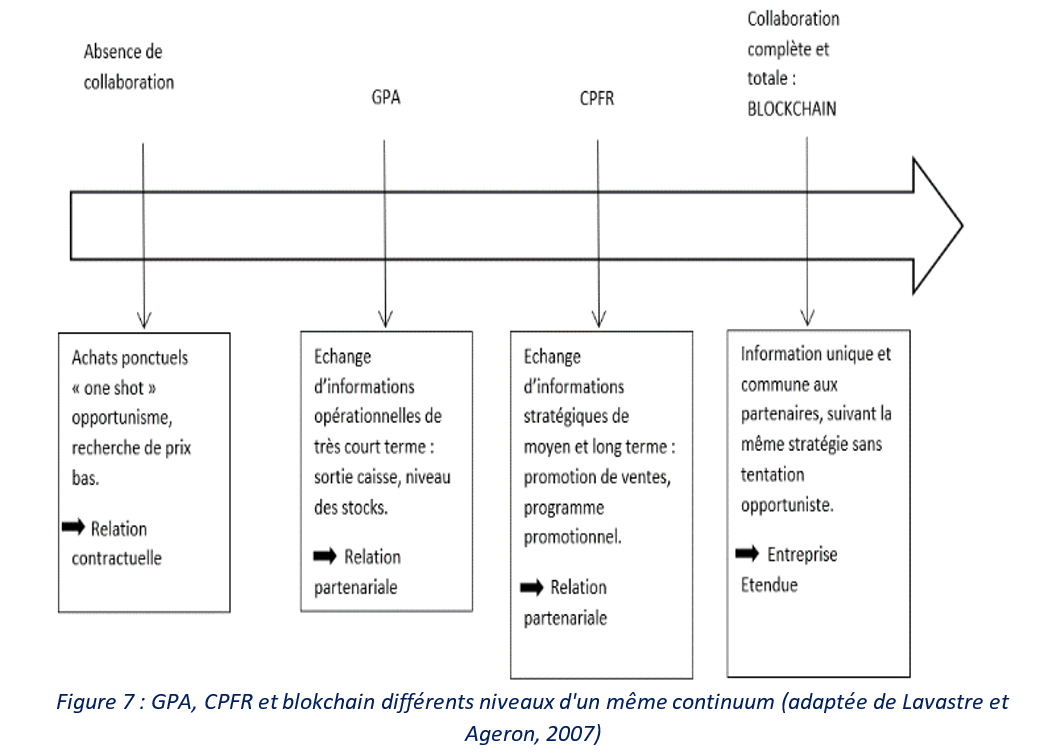 Considérons maintenant l’ensemble d’une chaîne logistique et les problématiques inter et intra organisationnelles associées. En effet, le modèle de Mentzer et al. souligne le fait que l’un des principes fondateurs du SCM est que la performance de la chaine logistique implique une coordination, « une gestion des interfaces » de l’ensemble des acteurs impliqués dans le pilotage des flux. Par conséquent, si la gestion de l’ensemble des informations, de leur circulation, de leur stockage et de leur traitement est la clé de la Supply Chain, un ensemble de principes doivent être adoptés afin de favoriser la gestion des interfaces (décloisonnement inter-fonctionnel en interne et formes de coopération, mise en réseau en externe) : intégration des comportements, partage mutuel des informations, partage mutuel des informations, coopération, etc. La blockchain pourrait constituer une source de données permettant de faciliter la mise en pratique des principales méthodes collaboratives inter-entreprises que sont la GPA (Gestion Partagée des Approvisionnements) et le CPFR (Collaborative Planning, Forecasting and Replenishment). Suivant Lavastre et Ageron (2007) : « La flexibilité des outils inter-organisationnels se retrouve également au niveau de leur facilité d'opérationnalisation : une simple extraction d'une base de données de l'entreprise, envoyée par courrier électronique à son partenaire, peut constituer, selon les informations communiquées, de la VMI ou du CPFR. La technique de doit pas constituer un frein à cet échange d'informations, mais le déclenchement des actions doit provenir d'un choix délibéré des acteurs et les organisations. » La blockchain peut devenir un moyen de structuration de ces échanges et constituer un modèle d’entreprise étendue.
